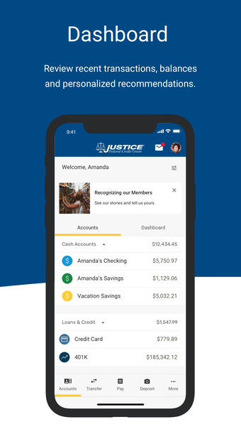 العدل الفيدرالي المحمول هو تطبيق مصرفي محمول مجاني وآمن وسريع يسمح لك بإدارة أمورك المالية أثناء التنقل. تم تصميم التطبيق لتوفير سهولة الوصول إلى حساباتك في جمعية العدل الفيدرالية للائتمان من أي جهاز محمول. باستخدام العدل الفيدرالي المحمول، يمكنك إدارة تفضيلات بطاقتك الائتمانية وبطاقة الخصم، والتحقق من الأرصدة، والبحث في سجل المعاملات، وإيداع الشيكات باستخدام الإيداع عن بعد، ودفع الفواتير، والتحكم في متى وأين وكيفية استخدام بطاقتك. يمكنك أيضًا تحويل الأموال بين حساباتك في العدل الفيدرالي وحسابات في مؤسسات مالية أخرى، وإعداد أهداف التوفير، وتقديم طلب للحصول على قرض باستخدام نماذج طلب معبأة مسبقًا.